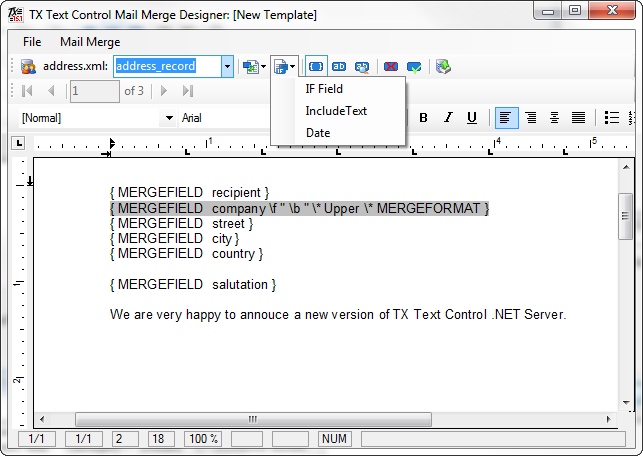 The combination of TX Text Control's MS Word compatible field functionality and TX Text Control Server for ASP.NET (incl. Windows Forms)'s automated MailMerge component is a very powerful toolset to build high performance and MS Word compatible mail merge applications.
