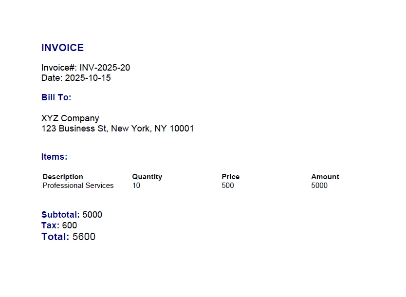 { "InvoiceNumber": "INV-2025-20", "InvoiceDate": "2025-10-15", "CustomerName": "XYZ Company", "CustomerAddress": "123 Business St, New York, NY 10001", "Item": "Professional Services", "Qty": 10, "Price": 500, "Amount": 5000, "Subtotal": 5000, "Tax": 600, "Total": 5600 } -