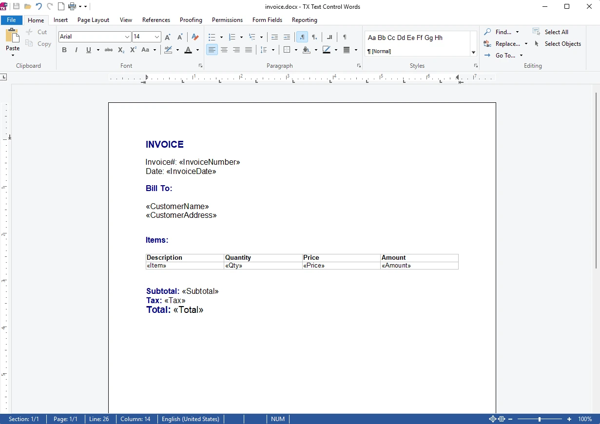 A sample invoice template is designed in TX Text Control Words, a precompiled demo application that ships with TX Text Control, for this example. The MailMerge reporting engine is used to populate merge fields with actual hierarchical data from JSON into the template.