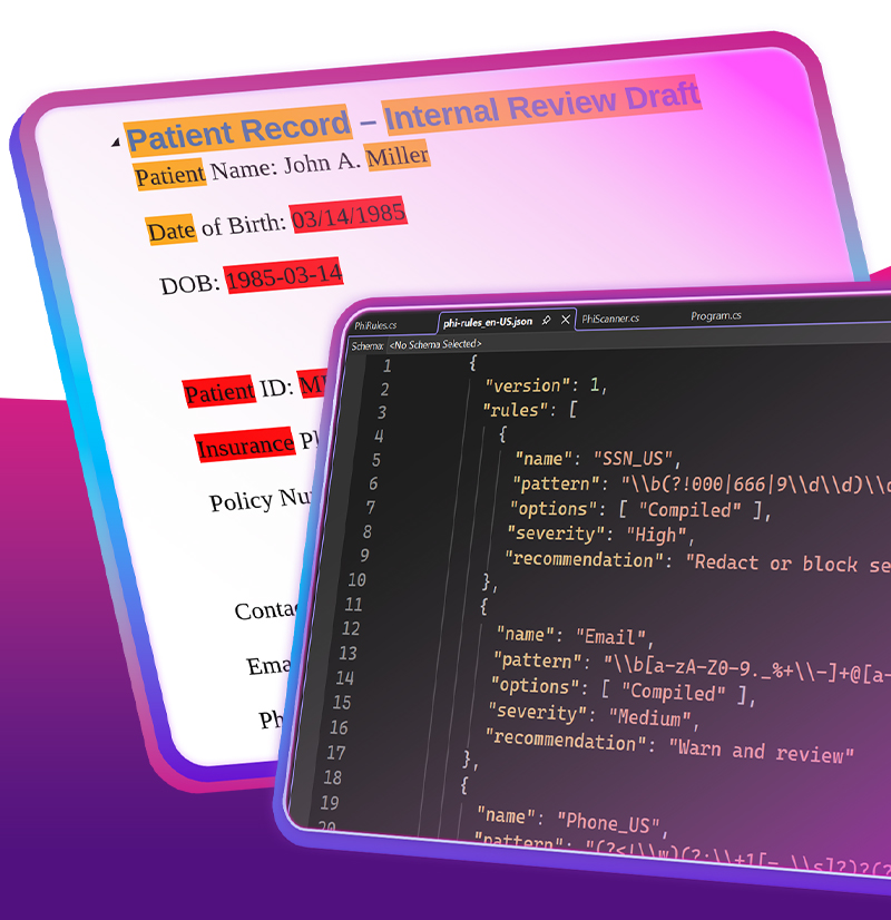 | In this article, we explore how to implement rule-based text analysis in C# .NET to detect Protected Health Information (PHI) and Personally Identifiable Information (PII) within documents. We utilize regular expressions and Text Control's ServerTextControl to efficiently identify sensitive data, ensuring compliance with data protection regulations. |