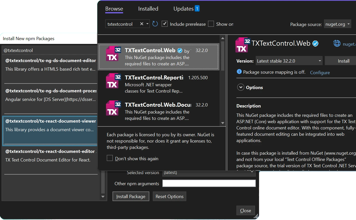 Ready-to-use packages. TX Text Control provides out-of-the-box packages hosted on npm and NuGet, making it easy to integrate document processing into applications.