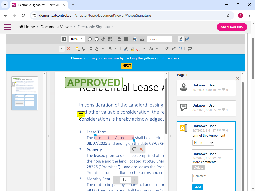 The DocumentViewer provides a JavaScript signature pad for signing documents electronically. Using TX Text Control .NET Server, the entire digital signature process can be embedded into your business application.