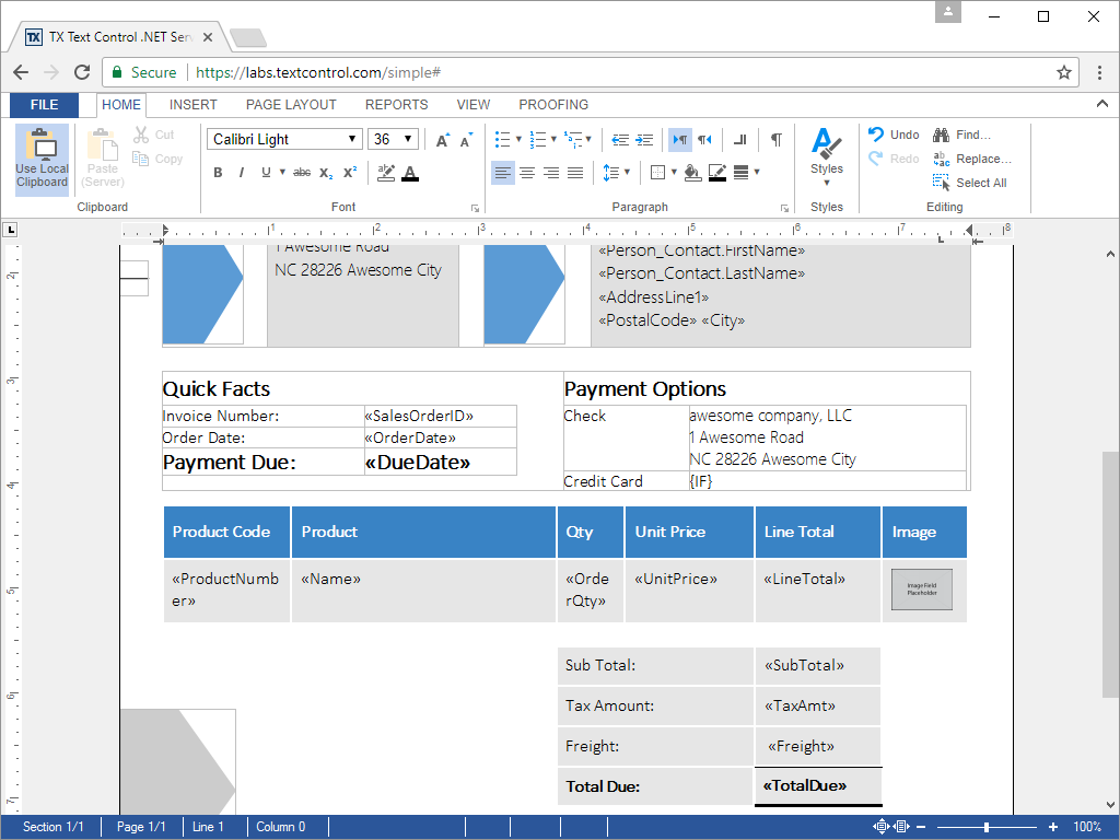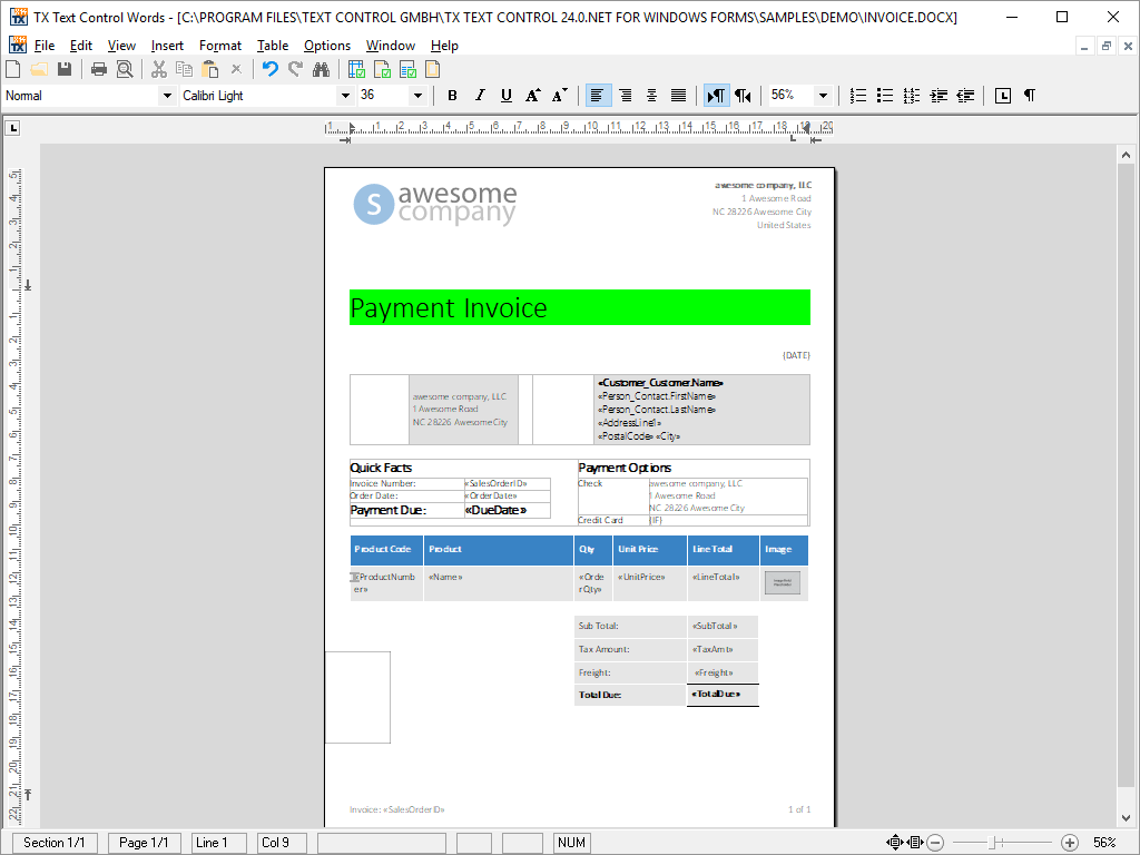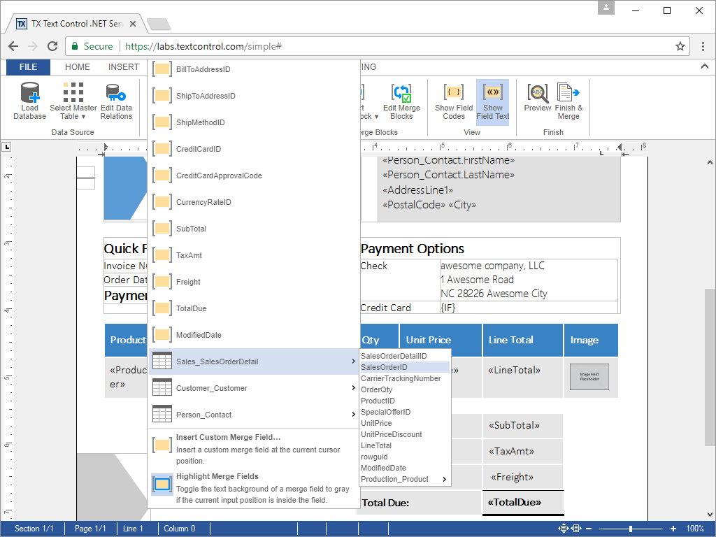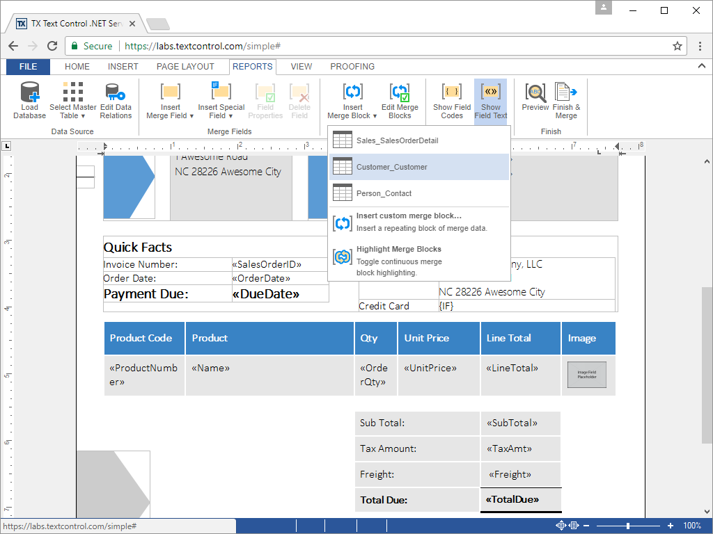 Mail merge: DataSourceManager simplifies reporting template creation. The new Reporting ribbon tab is based on the new public class DataSourceManager that encapsulates the complete handling, logic, and ready-to-use dialog boxes for the reporting template creation task. Essentially, the DataSourceManager provides all information required to create a fully-featured template designer. Like with MailMerge, a data source can be loaded from a DataSet, DataTable, JSON, an object, or XML.