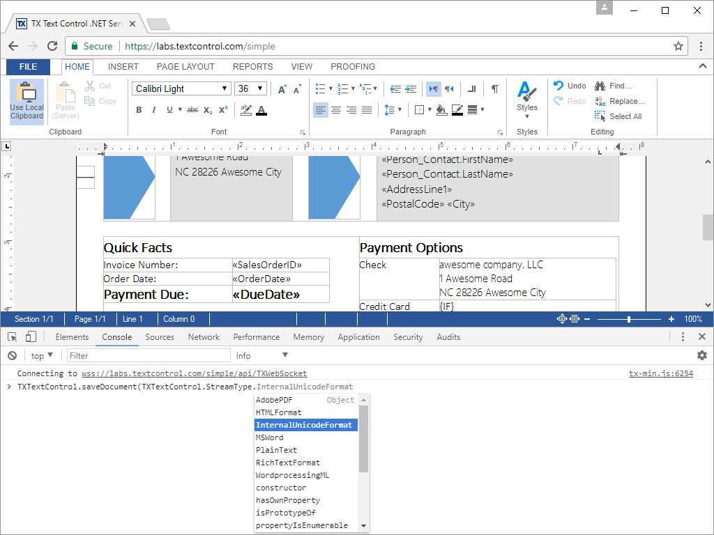 The JavaScript API of Web.TextControl has been enhanced substantially. For example, it is now possible to load an XML database, set and load text into the current selection, retrieve document text parts or set control colors using new JavaScript functions and properties. Additionally, 16 events have been added to the editor.Custom properties