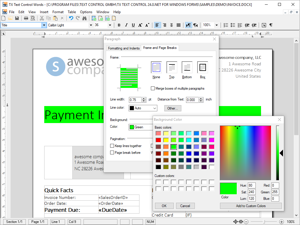 Color complete paragraphs and their frames with easy-to-use settings. A complete paragraph and the paragraph frames can now be colored. The dialog boxes and ribbon tabs have been designed to adjust these settings using a flawless user experience.