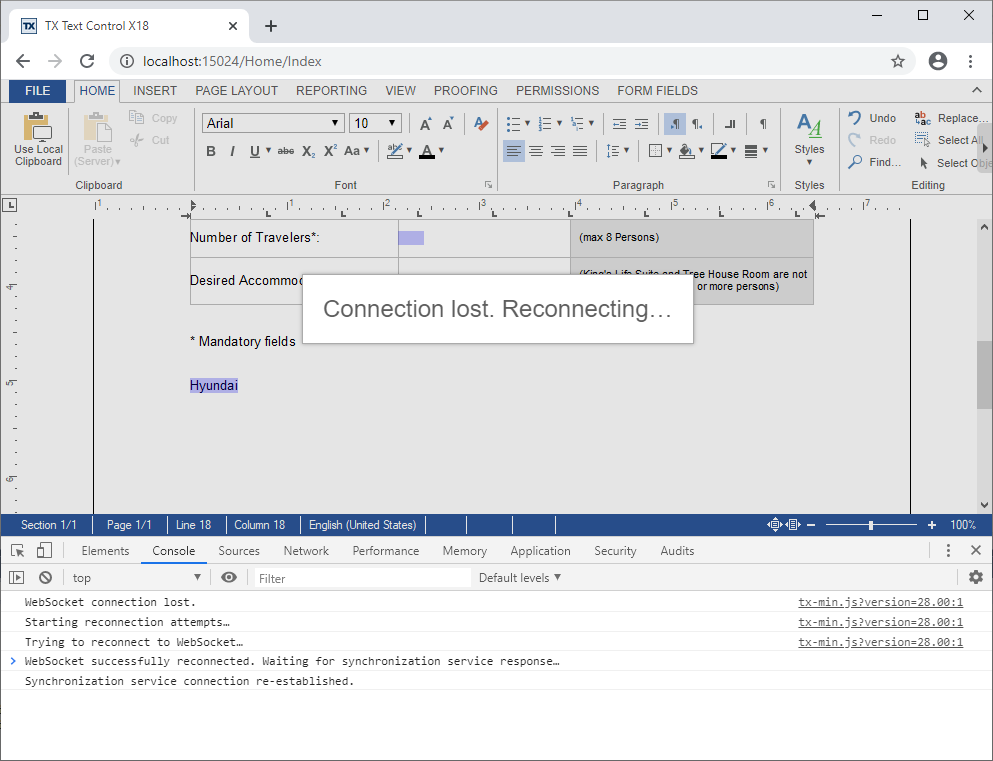 Automatically reconnect WebSockets to preserve document state. TX Text Control .NET Server X18 introduces a new feature to reconnect the WebSocket connection, in case it is lost. The WebSocket connection is required to synchronize the document in order to provide a consistent, true WYSIWYG rendering. When the connection is lost, TX Text Control tries to reconnect to the same instance for a specific period of time.