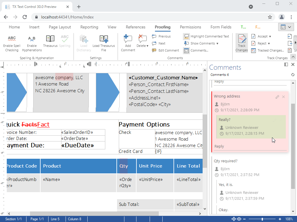 Different authors can add comments to all text ranges and attach MS Word compatible comments to tracked changes in TX Text Control .NET for Windows Forms. Comments can be imported and exported from and to MS Word formats, including Office Open XML, DOC, and RTF.