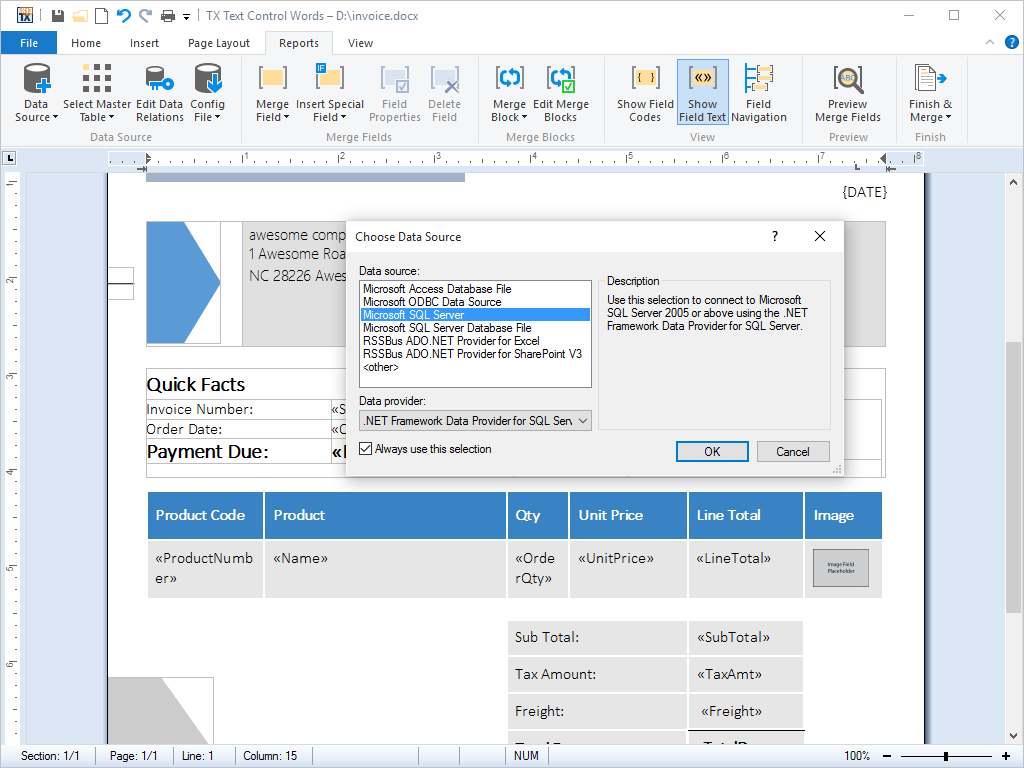 Using a fully abstracted database layer, TX Text Control .NET for Windows Forms can load and save plain text and formatted text blocks from and to all databases.