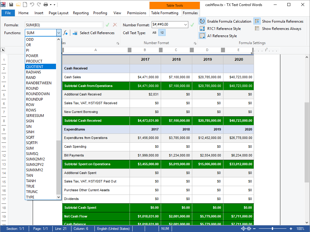 More than a hundred different formulas are supported and can be combined using TX Text Control .NET for Windows Forms.