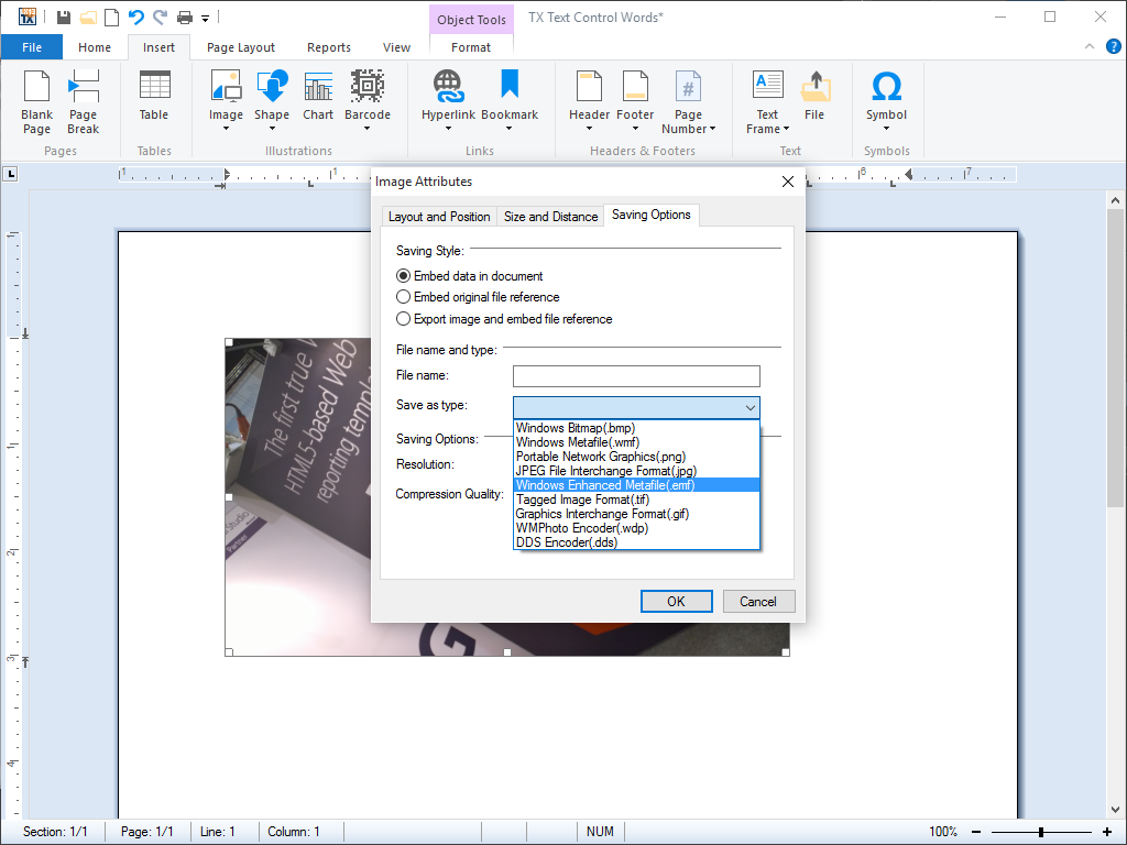TX Text Control .NET for Windows Forms offers various image insertion modes using the FrameBase class and supports a wide range of image file formats. The supported insertion modes include: