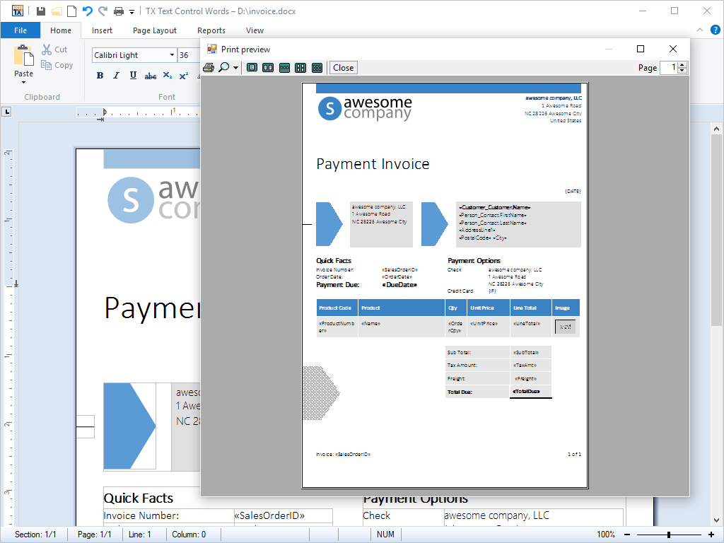 For developers with extreme printing demands, advanced printing functions allow implementing features such as printing multiple controls or even combining TX Text Control .NET for Windows Forms with other objects on a single printed page.