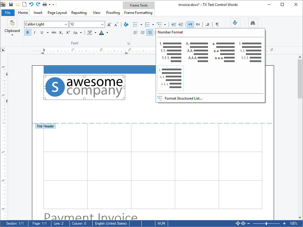 TX Text Control comes with pre-configured ribbon tabs, offering the following features and functionalities: