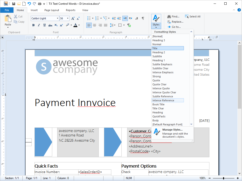 TX Text Control .NET for Windows Forms supports both paragraph and character styles, with multiple style inheritance. The stylesheets are MS Word compatible and can be used with various file formats, including DOCX, DOC, and RTF.
