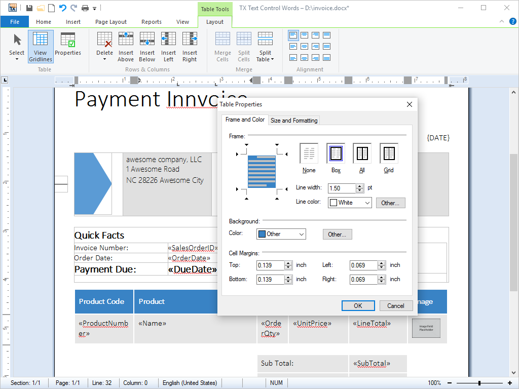 TX Text Control .NET for Windows Forms offers a rich set of formatting options for tables, table cells, and the text within table cells.