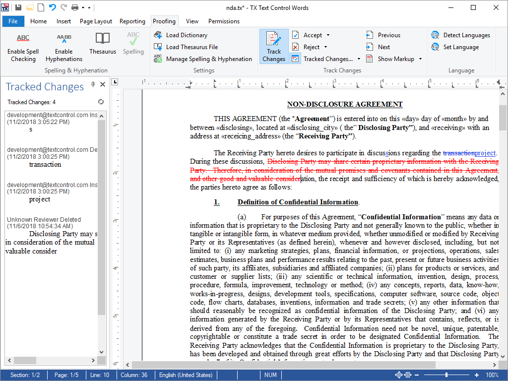 The track changes feature is fully programmable using the TX Text Control .NET for Windows Forms API. For each TrackedChange, you can retrieve the timestamp, type of change, position, text, highlight colors, and the associated author's name.