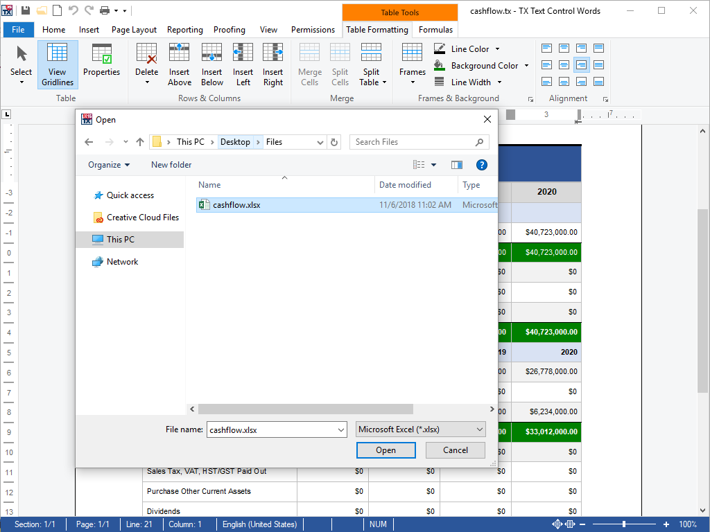 Using the shipped open and save dialog boxes, files can be opened in the XSLX file format and saved in any format supported by TX Text Control .NET for Windows Forms. As TX Text Control is primarily designed for document processing, it supports saving documents in page-oriented formats.