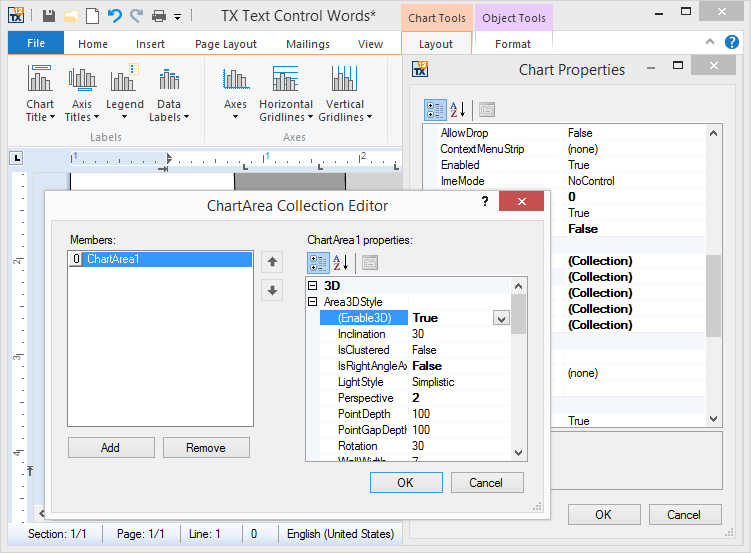 New dialog for adjusting chart properties like style, labels. The template designer TX Text Control Words provides a new dialog to adjust the properties of chart objects. All properties, including the chart style, legends, labels, series, and titles, can be adjusted.