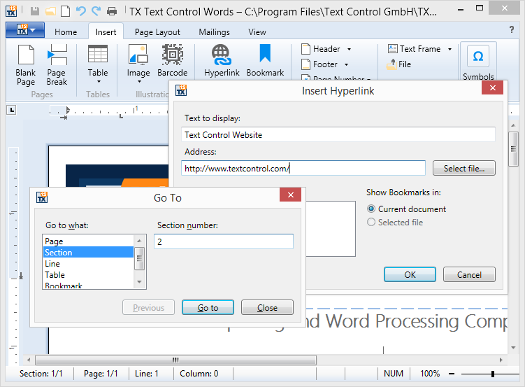 New dialog boxes for hyperlinks, bookmarks, and navigation. TXTextControl for WPF provides additional built-in dialog boxes for inserting, editing, and deleting hyperlinks and bookmarks. The WPF.HyperlinkDialog class provides a dialog box to insert either a HypertextLink to an external location or a DocumentLink to a location in the same document.