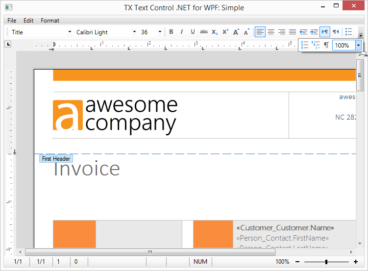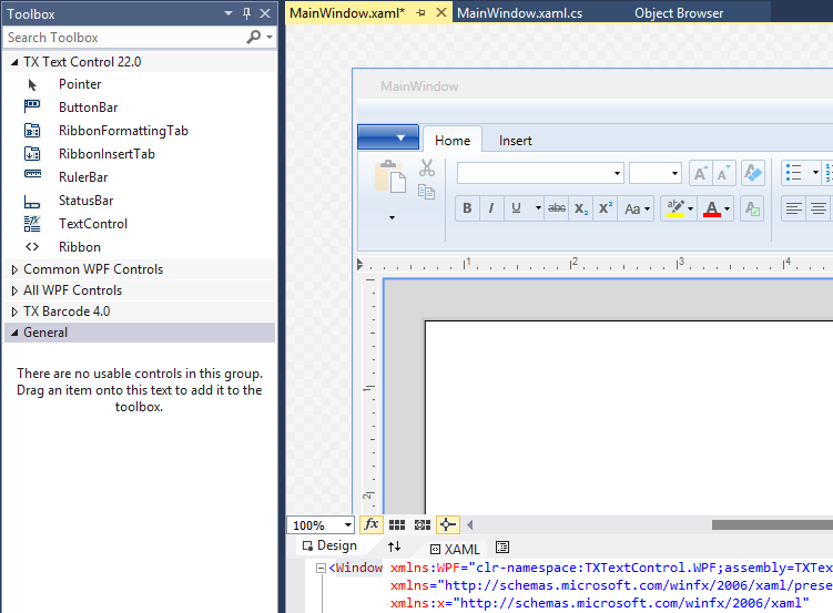 Ready-to-use, customizable ribbon tabs for typical tasks. TX Text Control .NET for WPF X12 is shipped with ready-to-use ribbon tabs that are connected to a System.Windows.Controls.Ribbon.Ribbon object. The ribbon tabs are completely customizable and provide the typical tasks such as formatting text or inserting objects such as images, headers and footers, or barcodes.