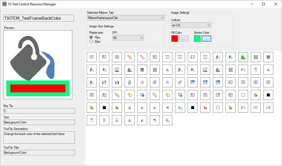 This way, you can use all TX Text Control resources in other user interfaces to provide a consistent user experience. The ResourceProvider allows developers to request a specific resource with a custom resolution, a culture, and colors for icons that provide color settings such as "Text Color" or "Text Highlight Color".