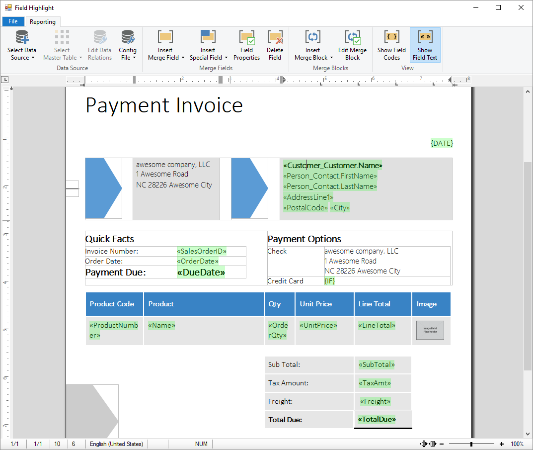 Each field can be highlighted with a different color which enables you to distinguish between different field types.